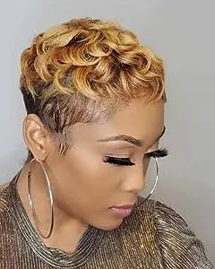 Yviann Short Human Hair Wigs for Black Women Glueless Pixie Wig Human Hair Layered Wavy Wigs with Bangs Pixie Curly Glueless Wigs Black with Brown F1B/33#
