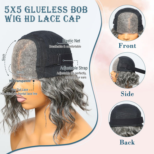 BAOHUKE 12" Glueless Salt And Pepper Human Hair Wigs Water Wave Grey Bob Wig Human Hair 5x5 HD Lace Closure Pre Cut Pre Plucked Loose Wave Gray Short Bob Wig for Women